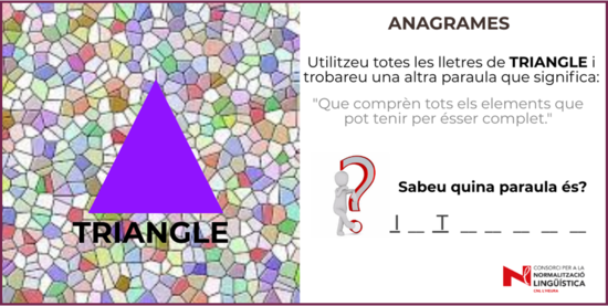 Utilitzeu totes les lletres de la paraula triangle i en trobareu una altra que significa “que comprèn tots els elements que pot tenir per ésser complet.