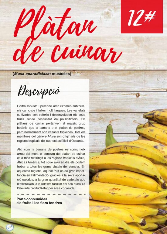 Herba robusta i perenne amb rizomes subterranis carnosos i fulles molt llargues. Les varietats cultivades són estèrils i desenvolupen els seus fruits sense necessitat de pol·linització. Els plàtans de cuinar pertanyen al mateix grup botànic que la banana o el plàtan de postres, però normalment són variants triploides. Tots els membres del gènere Musa són originaris de les regions tropicals del sud-est asiàtic i d'Oceania.