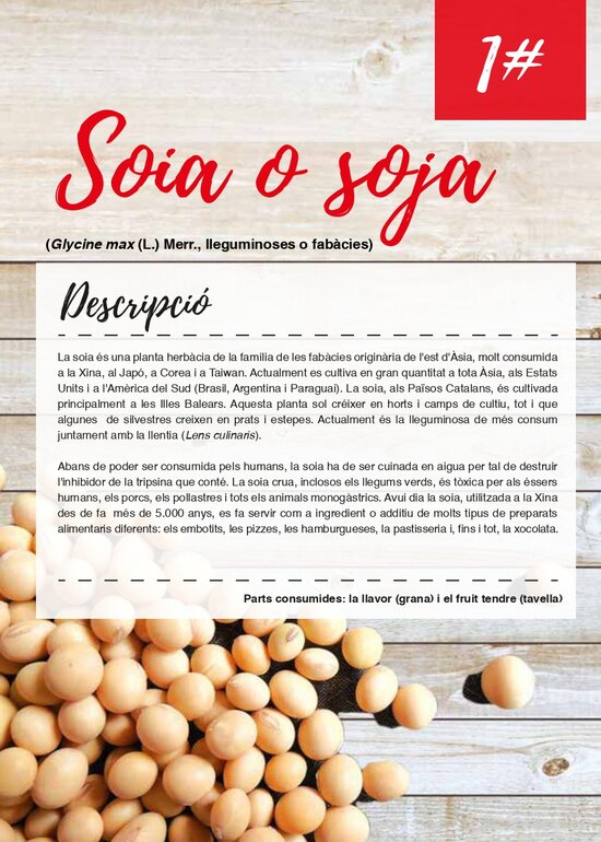 La soia és una planta herbàcia de la família de les fabàcies originària de l'est d'Àsia, molt consumida a la Xina, al Japó, a Corea i a Taiwan. Actualment es cultiva en gran quantitat a tota Àsia, als Estats Units i a l'Amèrica del Sud (Brasil, Argentina i Paraguai). La soia, als Països Catalans, és cultivada principalment a les Illes Balears. Aquesta planta sol créixer en horts i camps de cultiu, tot i que algunes de silvestres creixen en prats i estepes.