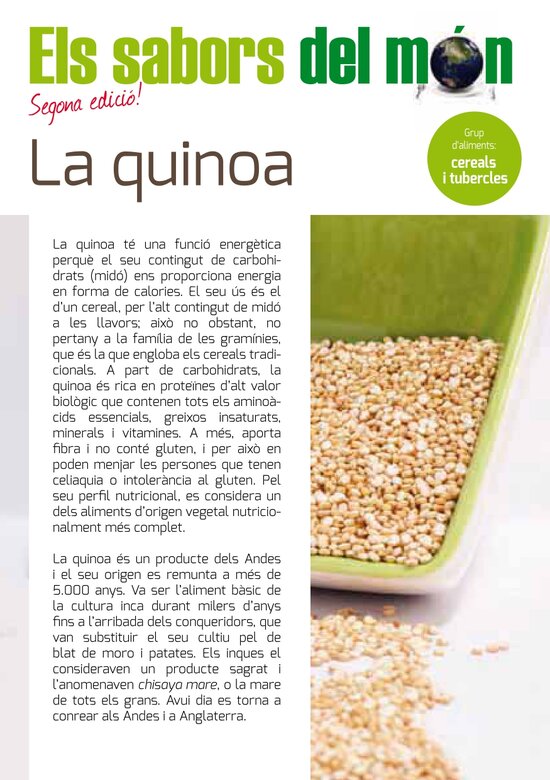 La quinoa té una funció energètica perquè el seu contingut de carbohidrats (midó) ens proporciona energia en forma de calories. El seu ús és el d'un cereal, per l'alt contingut de midó a les llavors; això no obstant, no pertany a la família de les gramínies, que és la que engloba els cereals tradicionals. A part de carbohidrats, la quinoa és rica en proteïnes d'alt valor biològic que contenen tots els aminoàcids essencials, greixos insaturats, minerals i vitamines. A més, aporta fibra i no conté gluten, i per això en poden menjar les persones que tenen celiaquia o intolerància al gluten. Pel seu perfil nutricional, es considera un dels aliments d'origen vegetal nutricionalment més complet.