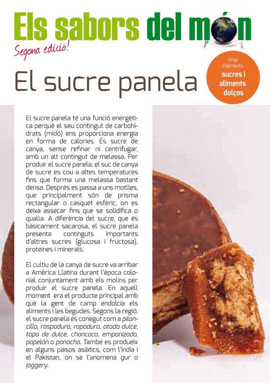 El sucre panela té una funció energètica perquè el seu contingut de carbohidrats (midó) ens proporciona energia en forma de calories. És sucre de canya, sense refinar ni centrifugar, amb un alt contingut de melassa. Per produir el sucre panela, el suc de canya de sucre es cou a altes temperatures fins que forma una melassa bastant densa. Després es passa a uns motlles, que principalment són de prisma rectangular o casquet esfèric, on es deixa assecar fins que se solidifica o qualla. A diferència del sucre, que és bàsicament sacarosa, el sucre panela presenta continguts importants d'altres sucres (glucosa i fructosa), proteïnes i minerals.