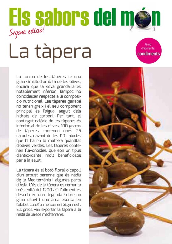 La forma de les tàperes té una gran similitud amb la de les olives, encara que la seva grandària és notablement inferior. Tampoc no coincideixen respecte a la composició nutricional. Les tàperes gairebé no tenen greix i el seu component principal és l'aigua, seguit dels hidrats de carboni. Per tant, el contingut calòric de les tàperes és inferior al de les olives: 100 grams de tàperes contenen unes 25 calories, davant de les 110 calories que hi ha en la mateixa quantitat d'olives verdes. Les tàperes contenen flavonoides, que són un tipus d'antioxidants molt beneficiosos per a la salut.