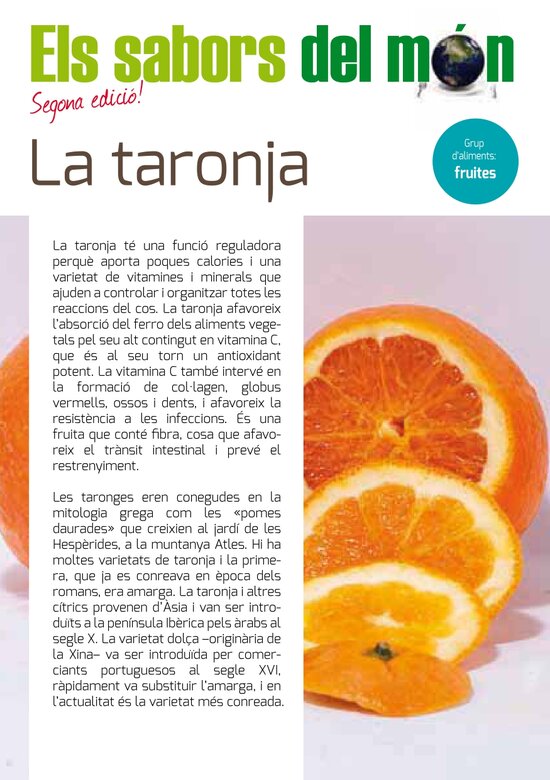 La taronja té una funció reguladora perquè aporta poques calories i una varietat de vitamines i minerals que ajuden a controlar i organitzar totes les reaccions del cos. La taronja afavoreix l'absorció del ferro dels aliments vegetals pel seu alt contingut en vitamina C, que és al seu torn un antioxidant potent. La vitamina C també intervé en la formació de col·lagen, globus vermells, ossos i dents, i afavoreix la resistència a les infeccions. És una fruita que conté fibra, cosa que el trànsit intestinal i prevé el restrenyiment.