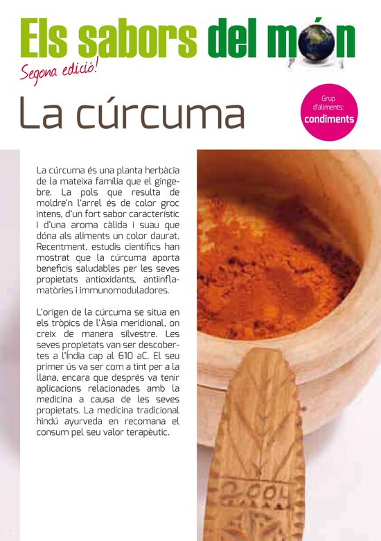 La cúrcuma és una planta herbàcia de la mateixa família que el gingebre. La pols que resulta de moldre'n l'arrel és de color groc intens, d'un fort sabor característic i d'una aroma càlida i suau que dona als aliments un color daurat. Recentment, estudis científics han mostrat que la cúrcuma aporta beneficis saludables per les seves propietats antioxidants, antiinflamatòries i immunomoduladores.