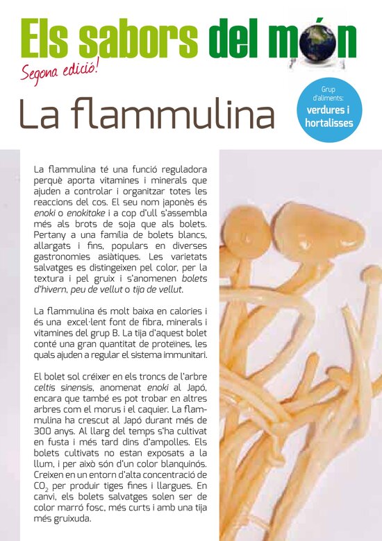 La flammulina té una funció reguladora perquè aporta vitamines i minerals que ajuden a controlar i organitzar totes les reaccions del cos. El seu nom japonès és enoki o enokitake i a cop d'ull s'assembla més als brots de soja que als bolets. Pertany a una família de bolets blancs, allargats i fins, populars en diverses gastronomies asiàtiques. Les varietats salvatges es distingeixen pel color, per la textura i pel gruix i s'anomenen bolets d'hivern, peu de vellut o tija de vellut.