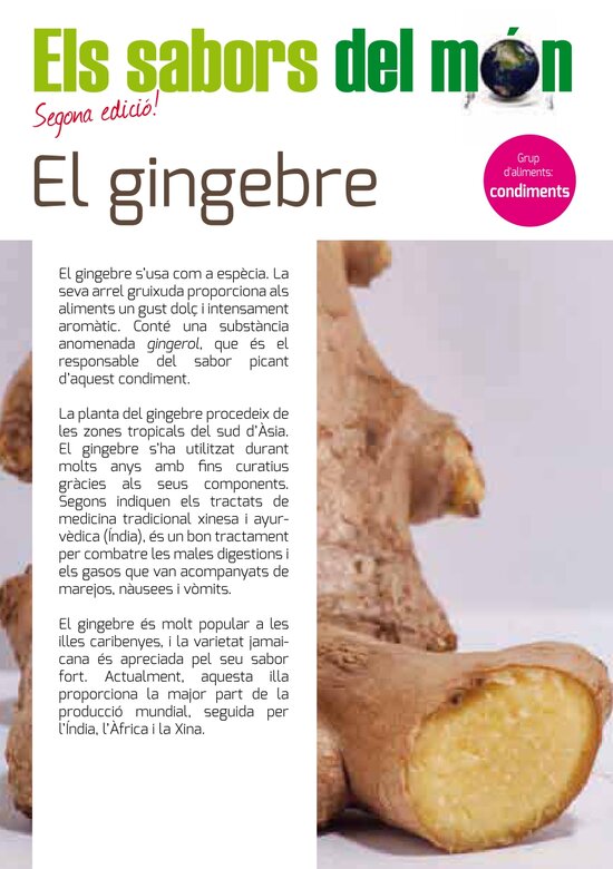 El gingebre s'usa com a espècia. La seva arrel gruixuda proporciona als aliments un gust dolç i intensament aromàtic. Conté una substància anomenada gingerol, que és el responsable del sabor picant d'aquest condiment.