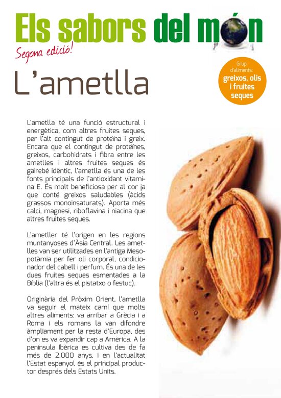 L'ametlla té una funció estructural i energètica, com altres fruites seques, per l'alt contingut de proteïna i greix. Encara que el contingut de proteïnes, greixos, carbohidrats i fibra entre les ametlles i altres fruites seques és gairebé idèntic, l'ametlla és una de les fonts principals de l'antioxidant vitamina E. És molt beneficiosa per al cor ja que conté greixos saludables (àcids grassos monoinsaturats). Aporta més calci, magnesi, riboflavina i niacina que altres fruites seques.