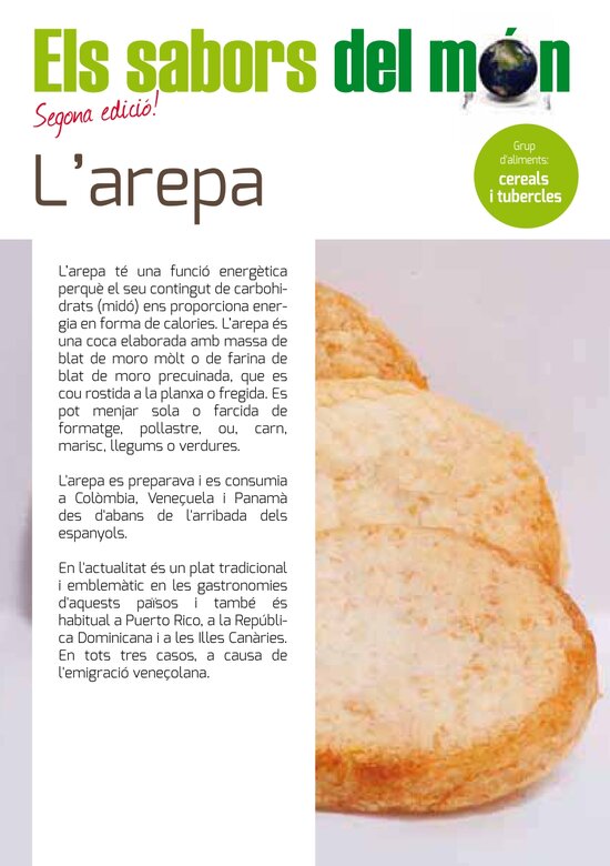 L'arepa té una funció energètica perquè el seu contingut de carbohidrats (midó) ens proporciona energia en forma de calories. L'arepa és una coca elaborada amb massa de blat de moro molt o de farina de blat de moro precuinada, que es cou rostida a la planxa o fregida. Es pot menjar sola o farcida de formatge, pollastre, ou, carn, marisc, llegums o verdures.