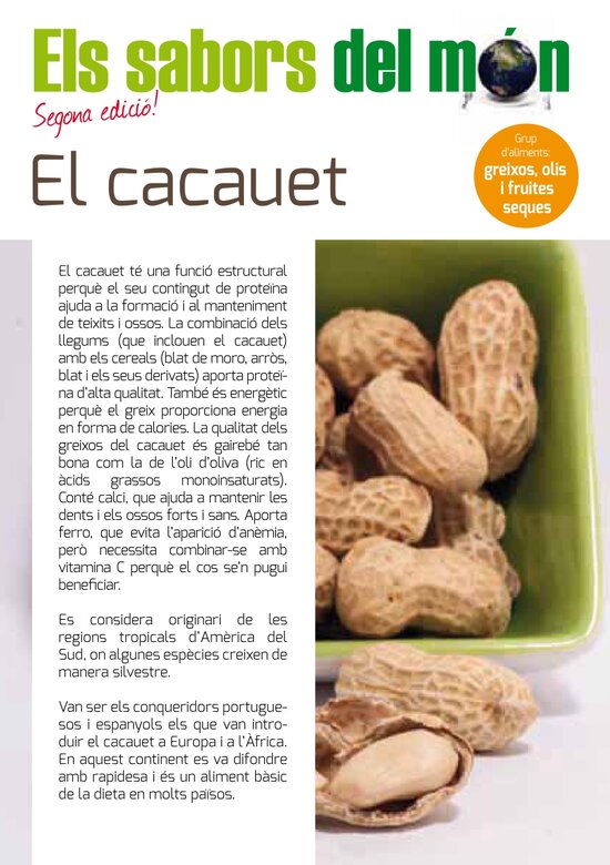 El cacauet té una funció estructural perquè el seu contingut de proteïna ajuda a la formació i al manteniment de teixits i ossos. La combinació dels llegums (que inclouen el cacauet) amb els cereals (blat de moro, arròs, blat i els seus derivats) proporciona proteïna d'alta qualitat. També és energètic perquè el greix proporciona energia en forma de calories. La qualitat dels greixos del cacauet és gairebé tan bona com la de l'oli d'oliva (ric en àcids grassos monoinsaturats). Conté calci, que ajuda a mantenir les dents i els ossos forts i sans. Aporta ferro, que evita l'aparició d'anèmia, però necessita combinar-se amb vitamina C perquè el cos se'n pugui beneficiar.