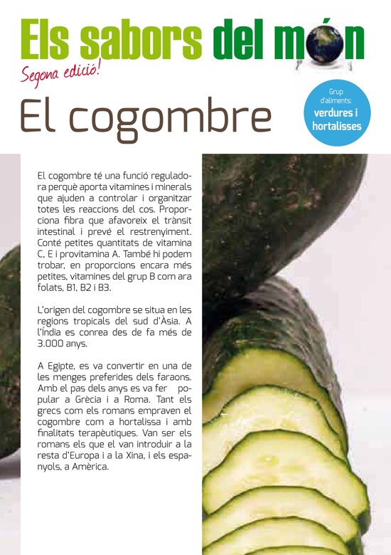El cogombre té una funció reguladora perquè aporta vitamines i minerals que ajuden a controlar i organitzar totes les reaccions del cos. Aporta fibra que afavoreix el trànsit intestinal i prevé el restrenyiment. Conté petites quantitats de vitamina C, E i provitamina A. També hi podem trobar, en proporcions encara més petites, vitamines del grup B com ara folats, B1, B2 i B3.