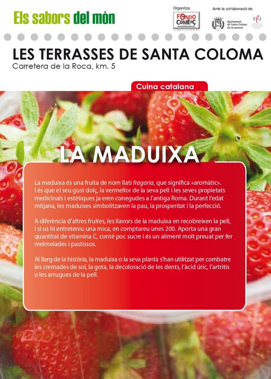 La maduixa és una fruita de nom llatí fragaria, que significa «aromàtic». I és que el seu gust dolç, la vermellor de la seva pell i les seves propietats medicinals i estètiques ja eren conegudes a l'antiga Roma. Durant l'edat mitjana, les maduixes simbolitzaven la pau, la prosperitat i la perfecció.A diferència d'altres fruites, les llavors de la maduixa en recobreixen la pell, i si us hi entreteniu una mica, en comptareu unes 200.