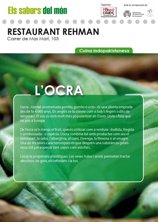L'ocra -també anomenada gombo, gumbo o ocro- és una planta emprada des de fa 4.000 anys. En anglès se la coneix com a lady's fingers («dits de senyora»). El seu ús està molt més popularitzat als Estats Units i Àsia que no pas a Europa.De l'ocra se'n menja el fruit, que és utilitzat com a verdura -bullida, fregida o arrebossada- o espècia.