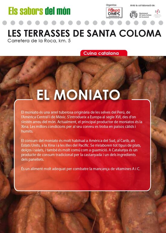 El moniato és una arrel tuberosa originària de les selves del Perú, de l'Amèrica Central i de Mèxic. S'introdueix a Europa al segle XVI, des d'on s'estén arreu del món. Actualment, el principal productor de moniatos és la Xina. Les millors condicions per al seu conreu es troba en països càlids i humits.