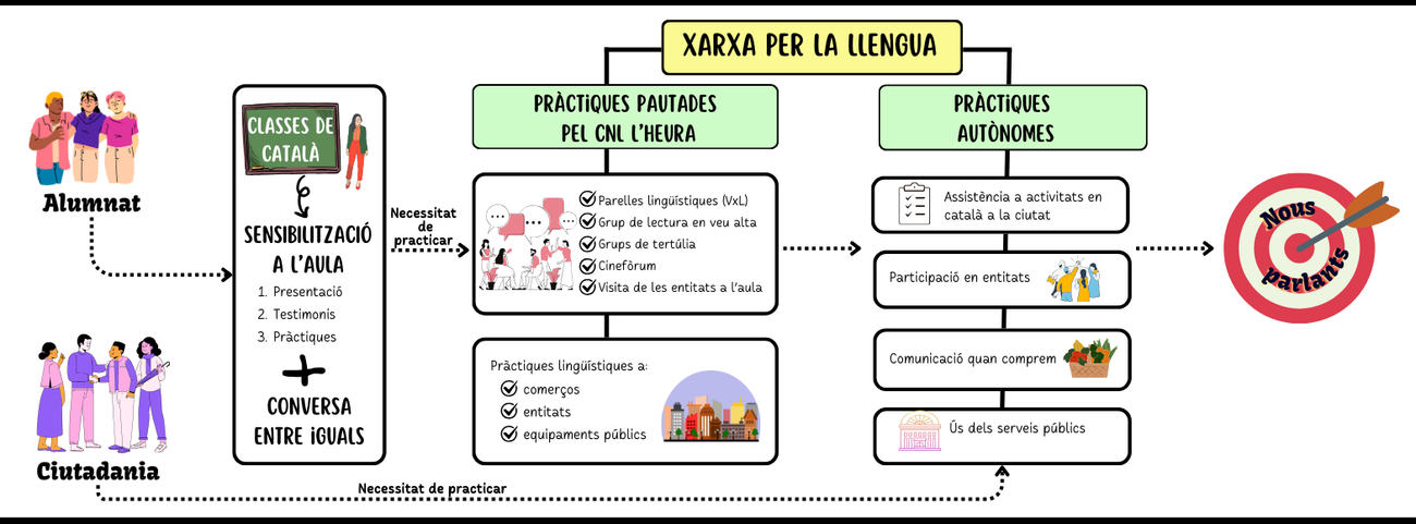 Amb la creació de la Xarxa per la llengua es vol donar un nou impuls a la presència del català a la ciutat. A través de les relacions personals, de les activitats col·lectives i del treball comunitari als barris de Santa Coloma, es vol donar a conèixer la llengua, animar a aprendre-la i estimar-la, i sobretot, oferir espais d'ús informals per practicar-la.