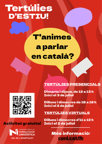 Proposem un cicle de tertúlies, presencials i virtuals, pensades per a aquelles persones que vulguin practicar la conversa en català i millorar l'expressió oral. A cada sessió els participants podran parlar de forma informal i col·loquial, en un ambient distès, sobre diversos temes. Les sessions virtuals s’inicien amb un vídeo breu publicat a les xarxes socials per influenciadors o youtubers que ens servirà d’excusa per iniciar la conversa. Les sessions presencials treballaran temes diversos basats en sèries, cançons o textos que serviran de material per desenvolupar la conversa entre els assistents. Aquestes tertúlies estan pensades, preferentment, per a alumnat amb nivells que vagin del Bàsic 3 a l’Elemental 3. Les places són limitades!