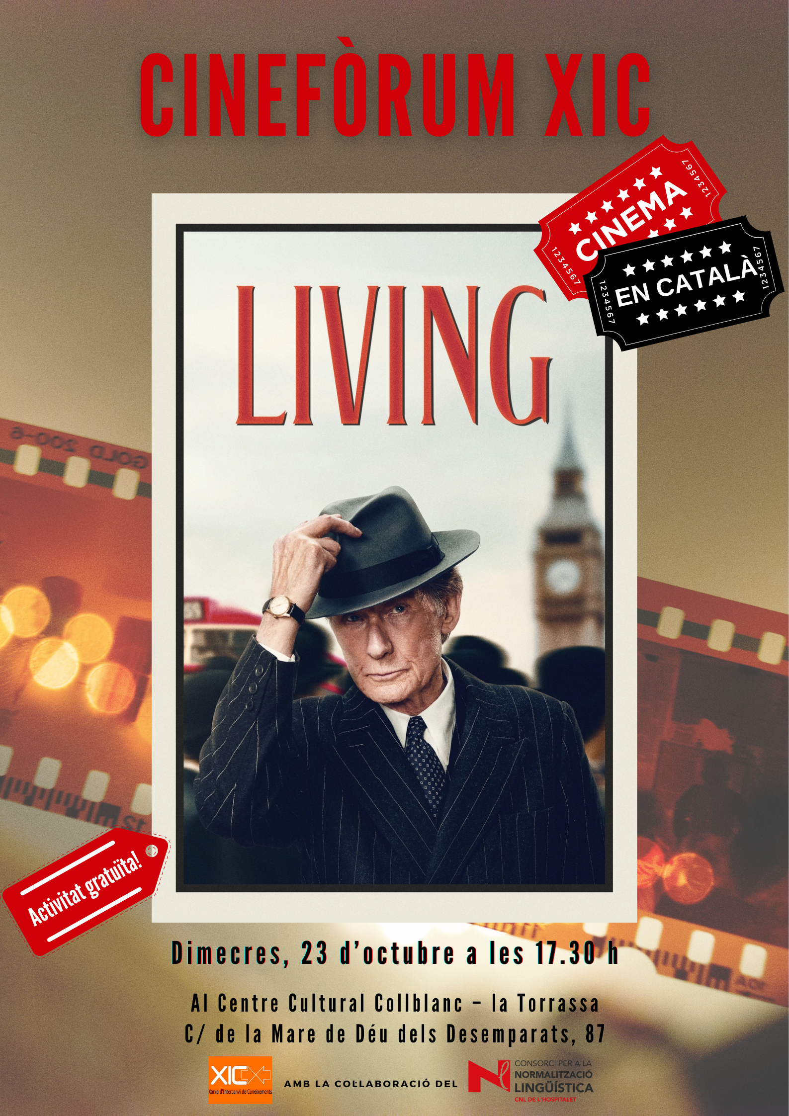 El pròxim dimecres 23 d'octubre torna el cinema al Cinefòrum XIC, amb la projecció de la pel·lícula Living. Aquest cicle de cinema en català és possible gràcies a la col·laboració entre la Xarxa d'Intercanvi de Coneixements (XIC) i el CNL de l'Hospitalet. L'entrada és gratuïta i oberta a tothom. La projecció tindrà lloc al Centre Cultural Collblanc-la Torrassa (c. Mare de Déu dels Desemparats, 87).