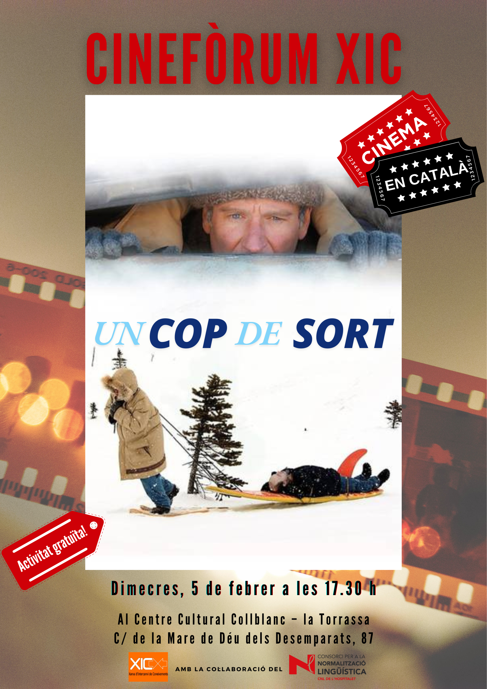 El pròxim dimecres, 19 de febrer, torna el cinema al Cinefòrum XIC, amb la projecció de la pel·lícula Un cop de sort. Aquest cicle de cinema en català és possible gràcies a la col·laboració entre la Xarxa d'Intercanvi de Coneixements (XIC) i el CNL de l'Hospitalet. L'entrada és gratuïta i oberta a tothom. La projecció tindrà lloc al Centre Cultural Collblanc-la Torrassa (c. Mare de Déu dels Desemparats, 87).