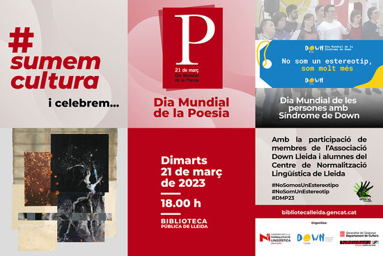 Commemoració conjunta del CNL de Lleida, la Biblioteca Pública de Lleida i l’Associació Down Lleida pel 21 de març, Dia Mundial de la Poesia i Dia Mundial de la Síndrome de Down. Alumnes del CNL, voluntaris i aprenents del Voluntariat per la Llengua i usuaris de Down Lleida hi llegiran el poema de l’any en diverses llengües.