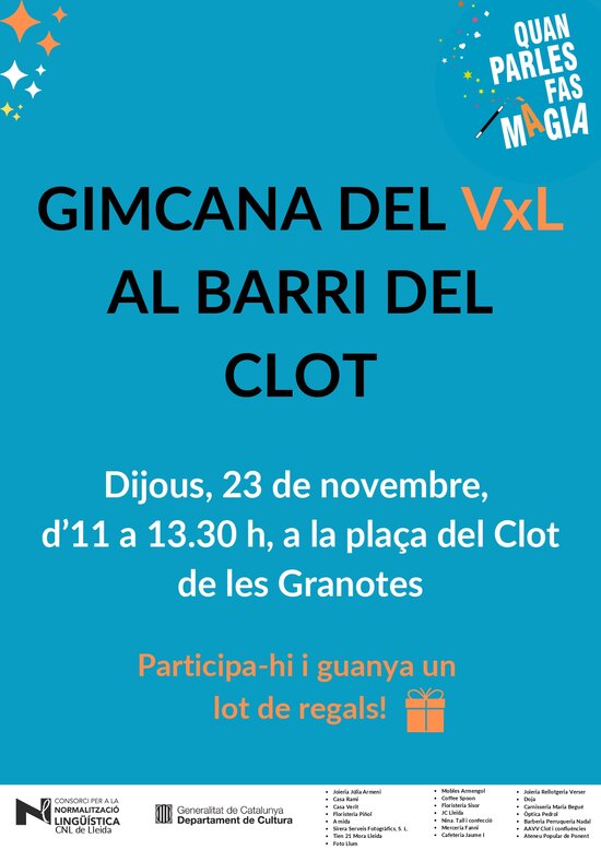 La gimcana del Clot s’emmarca dins de la campanya de dinamització “Al Clot, en català”. L’objectiu es donar a conèixer el Voluntariat per la Llengua, així com els establiments col·laboradors del barri. Cada EC tindrà una pregunta penjada a l’aparador sobre el VxL. Els ciutadans que decideixen participar-hi, hauran de respondre a tres preguntes. Els qui hi responguin correctament, entraran en el sorteig d’un lot de productes gentilesa dels ECs. El premi es lliurarà durant l’acte de cloenda de la campanya, dia 2 de desembre.
