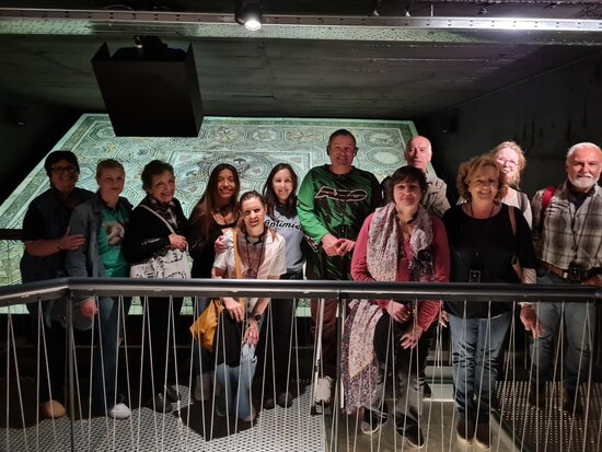 Amb l'ajut d'una audioguia i gràcies a la tecnologia més actual, alumnes i parelles lingüístiques van gaudir d'una visita immersiva que els va traslladar a la vida quotidiana dels segles V-VII dC i van passejar per un edifici octogonal romà únic a Catalunya.