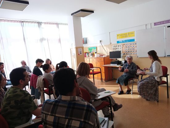 L'Àvia Remei ha tornat a les aules del Servei Local de Mataró per respondre les preguntes dels alumnes de Bàsic 3. El grup s'havia preparat diverses qüestions per fer-li a la Remei sobre la cuina tradicional. La cuinera ja havia visitat un nombrós grup d'alumnes fa uns dies. Va prometre tornar per atendre'n un altre, i ha complert.