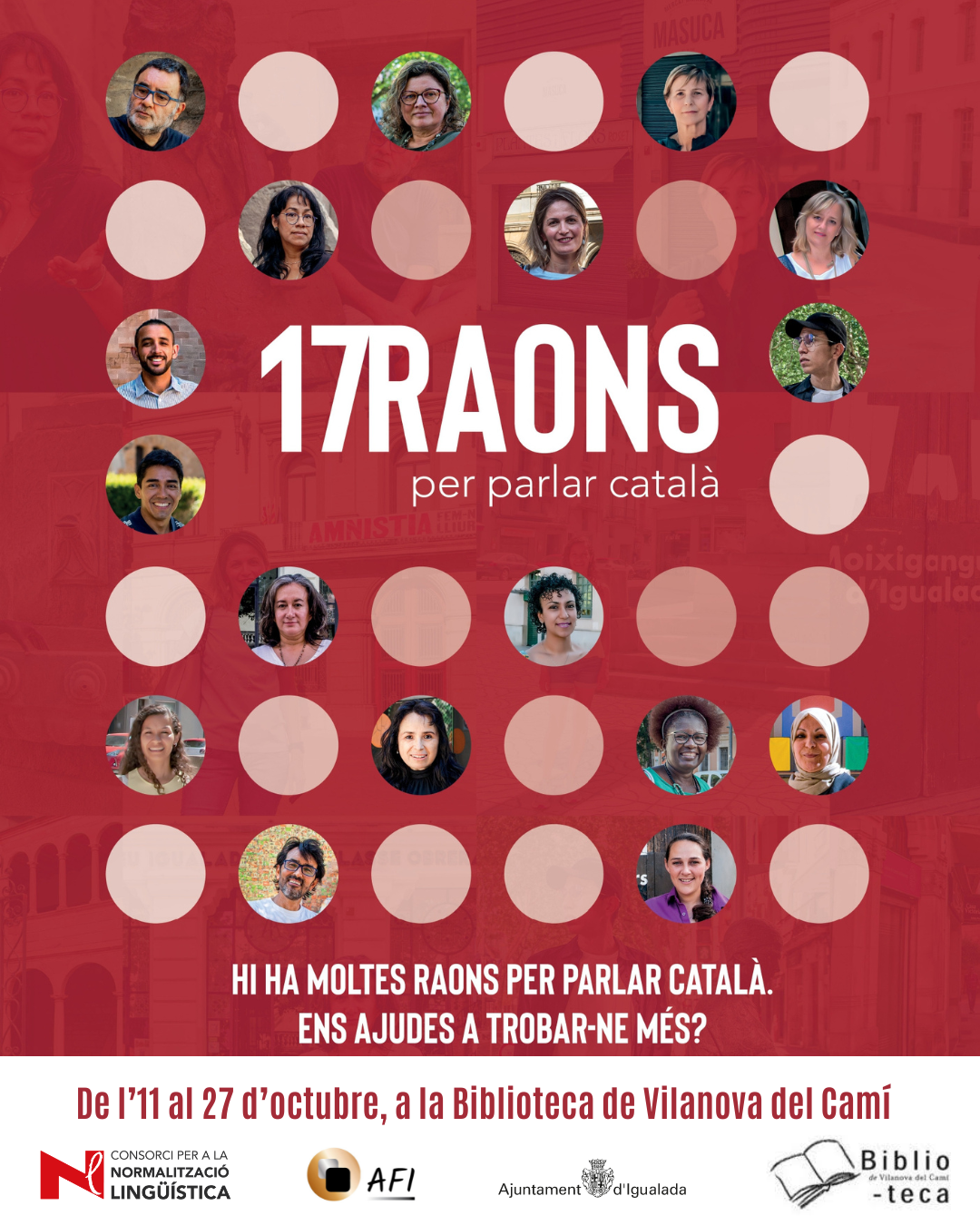L'exposició fotogràfica "17 raons per parlar català" recull el testimoni de 17 persones de diferents àmbits de la societat igualadina que, tot i que van néixer fora de Catalunya, han adoptat el català com a llengua d'ús habitual. Aquestes persones ens demanen que els parlem en català, que defugim prejudicis i que evitem el costum de canviar de llengua amb qui pensem que és foraster.