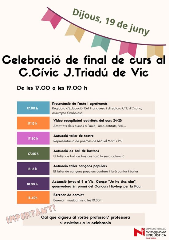 Dijous, 19 de juny a les 17.00 h, al Centre Cultural J.Triadú, tindrà lloc la celebració de la cloenda dels cursos del Centre de Normalització Lingüística d’Osona.