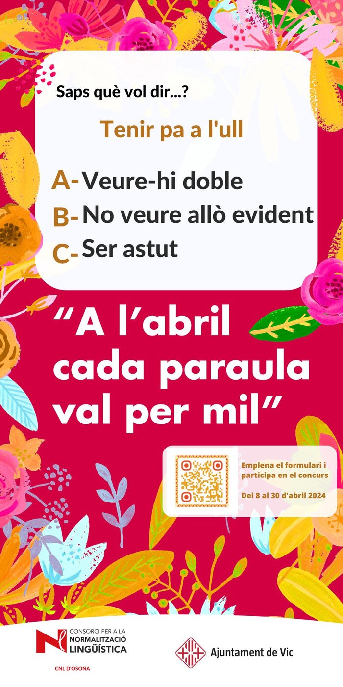 L'1 d'abril s'inicia per dotzè any consecutiu la campanya "A l'abril cada paraula val per mil" que posa a l'aparador dels comerços d'Osona la llengua i, més concretament, les frases fetes, a partir de les quals es fa un concurs.