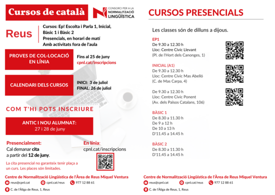 Si vols fer la inscripció presencialment a Reus: Sol·licita cita a partir del 12 de juny a reus(ELIMINAR)@cpnl.cat o al 977 128 861.