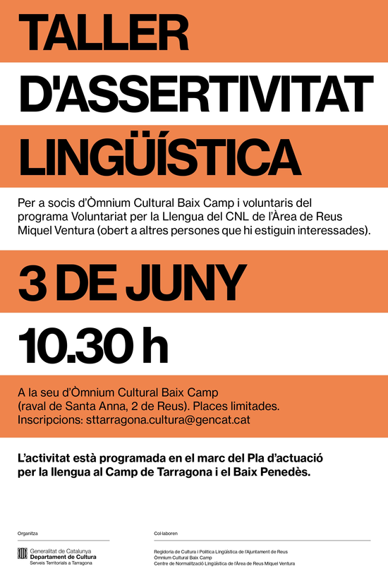 Activitat programada en el marc del Pla d'actuacions per la llengua al Camp de Tarragona i el Baix Penedès, organitzada pels ST de Cultura de la Generalitat amb la col·laboració de la Regidoria de Política Lingüística de l'Ajuntament de Reus, Òmnium Baix Camp i el Centre de Normalització Lingüística de l'Àrea de Reus Miquel Ventura.