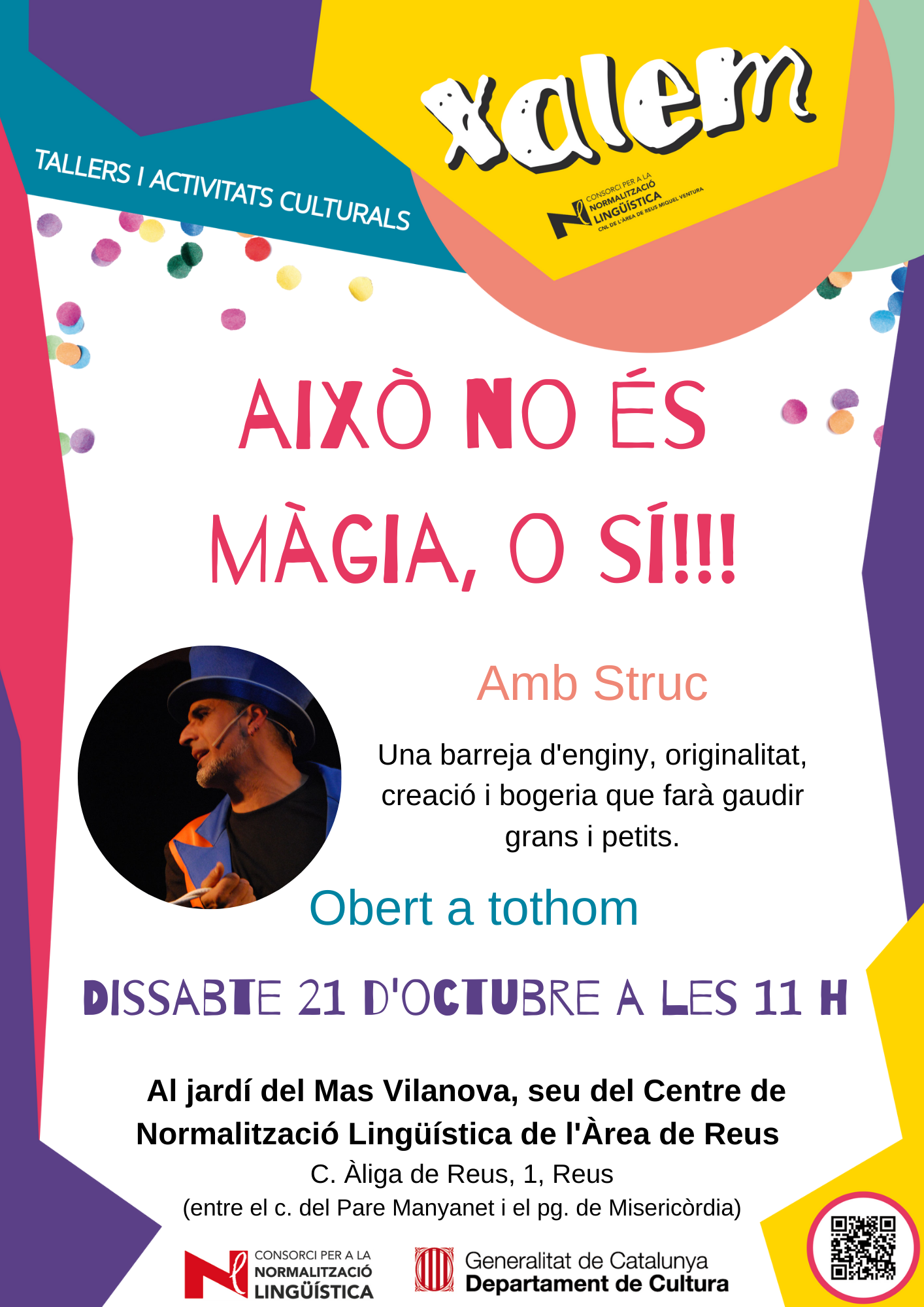 A més dels tallers, el Xalem 2023 també arriba amb activitats culturals i sortides a indrets emblemàtics del territori. Les d'aquesta edició són una activitat tutoritzada pel Museu d'Història de Cambrils, al qual agraïm la col·laboració, el 18 d'octubre, sota el títol Un món millor, i una cita per a grans i petits amb l'espectacle Això no és màgia, o sí!!!, a càrrec de Struc, el 21 d'octubre a Reus.