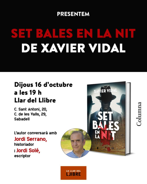L'autor, Xavier Vidal, conversarà amb l'historiador Jordi Serrano i l'escriptor Jordi Solé, a la Llar del Llibre, establiment col·laborador del Voluntariat per la llengua del CNL de Sabadell.
