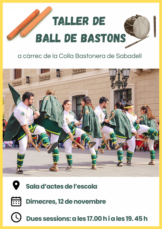 Taller de bastons obert a la ciutadania a l'Escola Oficial d'Idiomes de Sabadell, a càrrec de la Colla Bastonera de Sabadell, totes dues entitats col·laboradores del Voluntariat per la llengua del CNL de Sabadell.
