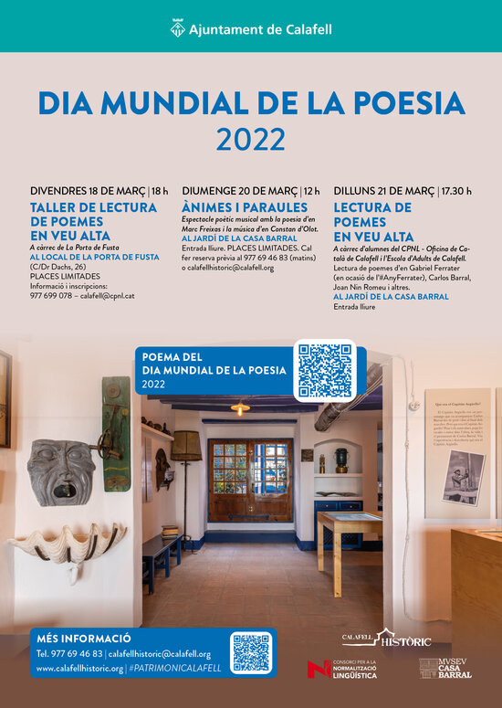 Taller per preparar el recital de poemes que es farà el dia 21 de març a la Casa Barral de Calafell. L’impartirà la companyia teatral La Porta de Fusta. Inscripció preferent per a als alumnes dels cursos de català del CPNL; si hi ha places lliures, s'hi podrà apuntar públic en general. Contacte: 977 699 078 – calafell@cpnl.cat. Inscripcions.