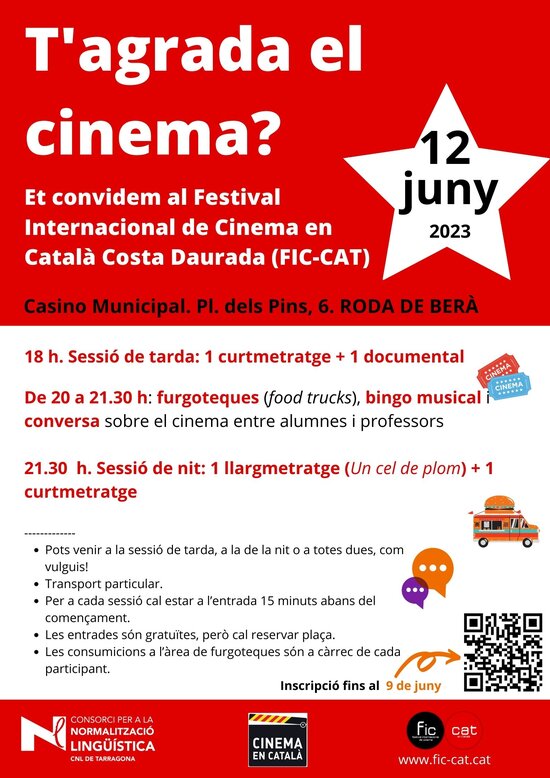 Tarda i nit de cinema al Festival Internacional de Cinema en Català Costa Daurada (FIC-CAT) amb alumnes i parelles lingüístiques per practicar la conversa. Entre sessió i sessió es podrà jugar al bingo musical i sopar a les furgoteques. Cal fer inscripció fins al 9 de juny! Entrada gratuïta, però el transport a càrrec de cadascú. Es poden portar acompanyants. Les pel·lícules són les següents (tràilers i més informació al web del FIC-CAT):
