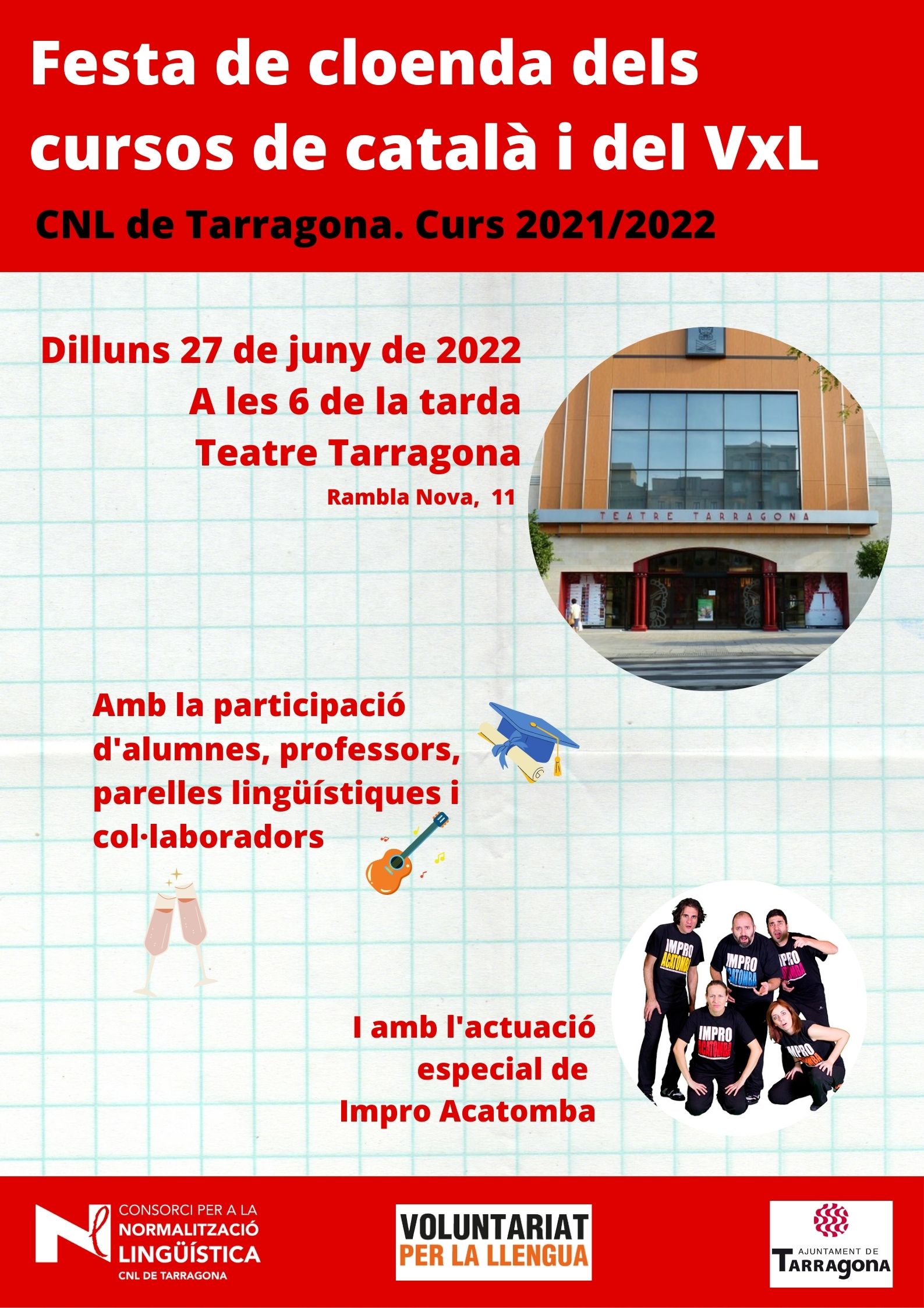 L'acte clourà l'any acadèmic del CNL de Tarragon i estarà presentat per la companyia de teatre especialista en improvisació Acatomba, que al final farà una actuació. Hi intervindran alumnes i professors per explicar les seves vivències en el curs. També es projectarà un audiovisual amb imatges i vídeos de les activitats dins i fora de l'aula. Finalment, s'exposaran les activitats relacionades amb el Voluntariat per la llengua, les pràctiques lingüístiques als establiments col·laboradors i el projecte Comerços a aprenents, càrrec dels seus protagonistes. L'acte s'acabarà amb un brindis de comiat. S'espera l'assistència del president del Consell de Centre Manel Castaño.