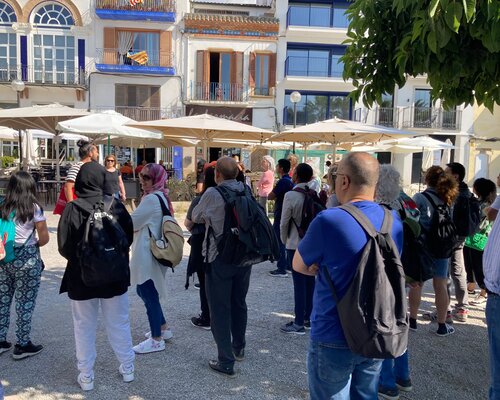 A les 8.30 h del matí hem sortit amb autocar de Rubí cap a la capital del Garraf. De part d'Òmnium Rubí han vingut alguns membres de la junta, entre els quals el president, Martí Pujol i Laura Vert, expresidenta. Del Servei de Català, la resta, entre participants del VxL i alumnes dels cursos de català per a adults. En arribar a Vilanova hem esmorzat al passeig Marítim, i allà ens han vingut a trobar membres de la junta d'Òmnium Garraf: el president, Jordi Baiges i la vicepresidenta, Carme Prades. De seguida hem iniciat l'activitat del matí, una visita pel nucli antic de Vilanova que ens ha dut Rambla amunt i fins a La Geltrú, sota el guiatge expert de Xavier López, historiador vilanoví. Ens ha anat explicant la història recent de la ciutat, els canvis esdevinguts arran de la revolució industrial, curiositats i canvis en el paisatge urbà, i el malbaratament de cert patrimoni local a causa dels plans urbanístics.