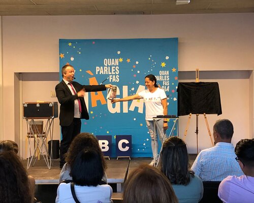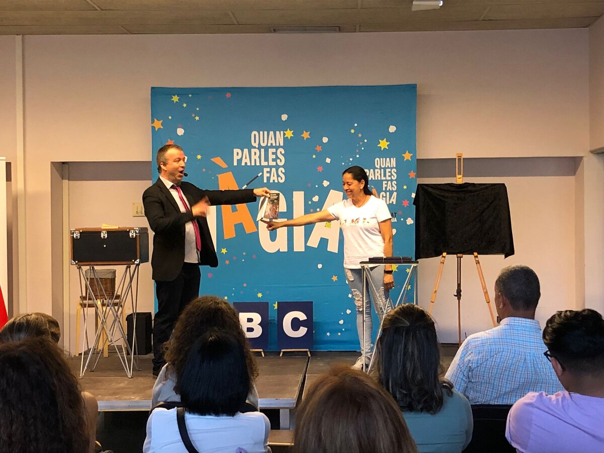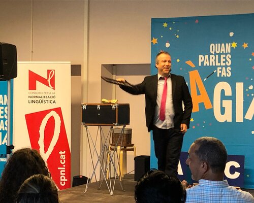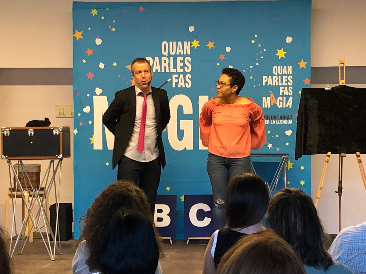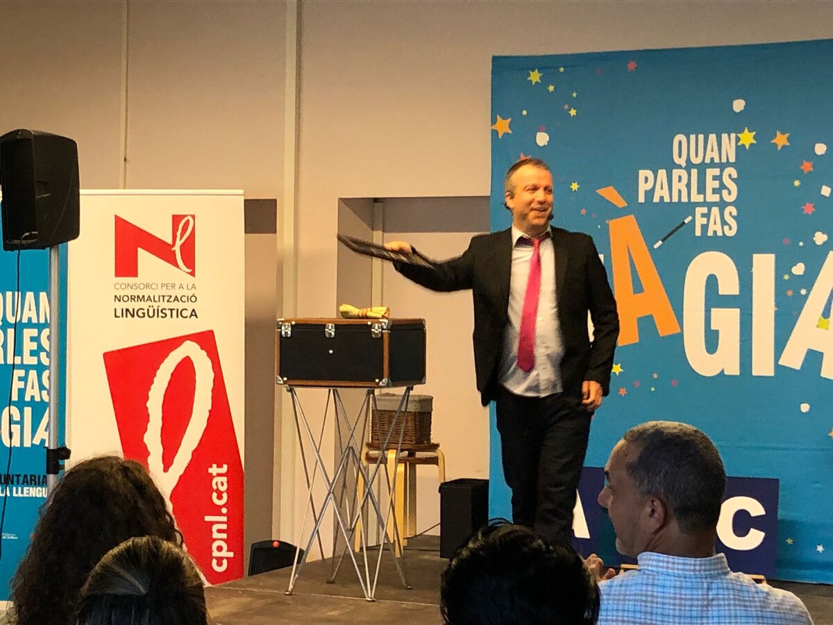 Tot seguit, el mag Eduard Juanola, protagonista de la campanya de promoció del Voluntariat per la llengua a Catalunya "Quan parles fas màgia", transportà el públic al món dels jocs lingüístics i de les connexions màgiques entre voluntaris i aprenents. Alguns trucs es van desenvolupar amb la participació d'alumnes i de parelles lingüístiques. Va ser una actuació molt celebrada pel públic.