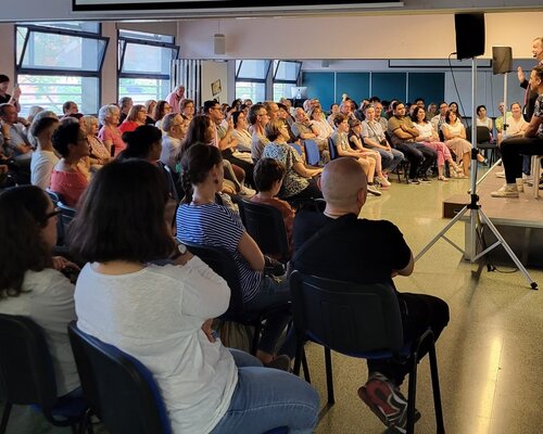 Després d'aquesta part més formal, arribà el moment d'alçar-se de les cadires i cantar i ballar la sardana reggaeton Coti x Coti que està tan de moda i que molts alumnes havien après a les aules.