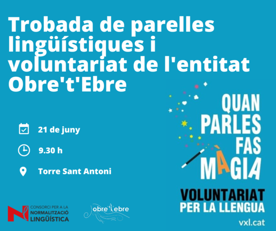 Dimarts 21 de juny, a les 9.30 h, se celebra una trobada de voluntaris i parelles lingüístiques d'Obre't'Ebre de Roquetes. L'acte tindrà lloc a la Torre Sant Antoni i està adreçat al personal tècnic i voluntari de l'entitat.