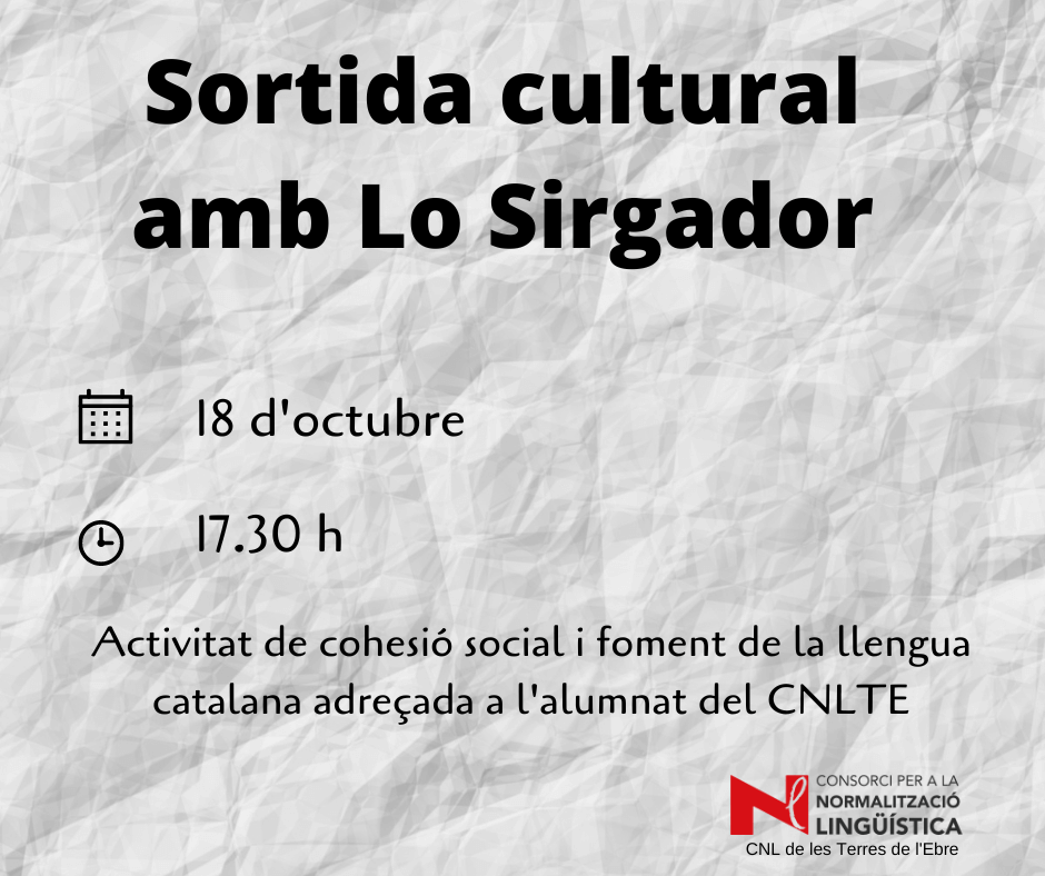 Dimarts 18 d'octubre, es realitza una sortida cultural amb Lo Sirgador pel riu Ebre al pas per Tortosa. Es tracta d'una activitat de cohesió social i foment de la llengua catalana adreçada a l'alumnat del CNLTE.