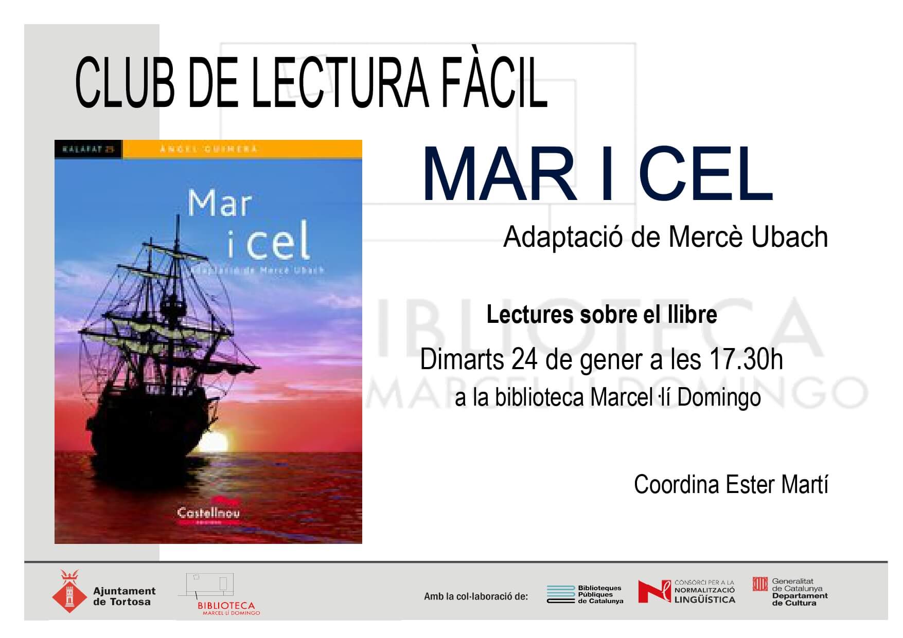 El dia 24 de gener, a les 17.30 h, a la Biblioteca Marcel·lí Domingo, de Tortosa, tindrà lloc el Club de Lectura Fàcil de Tortosa sobre el llibre Mar i cel, a càrrec del Voluntariat per la Llengua.