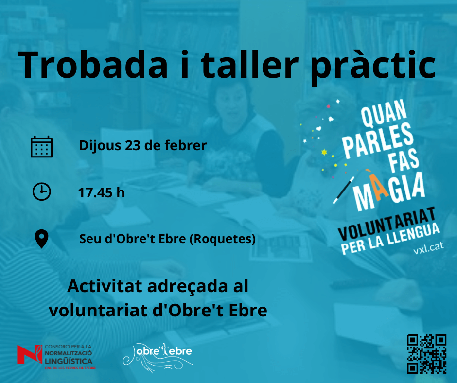 Dijous 23 de febrer, a les 17.45 h, a la seu de l’entitat Obre't’Ebre, hi ha una trobada i taller pràctic del programa Voluntariat per llengua.