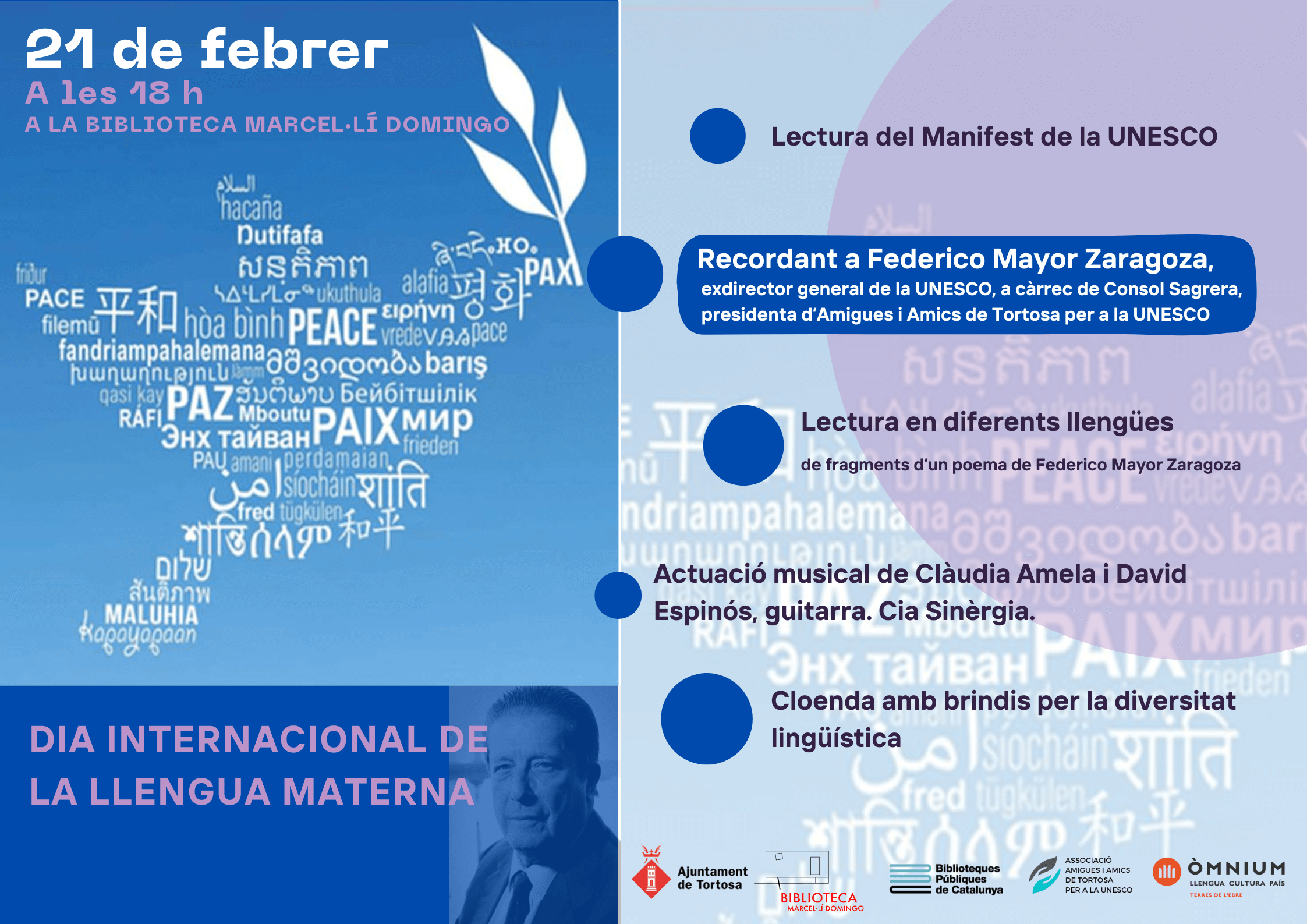 El dia 21 de febrer, a les 18.00 h, se celebra el Dia Internacional de la Llengua Materna a la Biblioteca Marcel·lí Domingo de Tortosa. Durant l’acte es recordarà a Federico Mayor Zaragoza, exdirector general de la UNESCO.