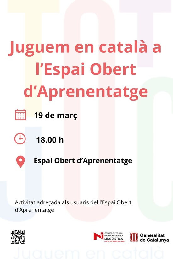 El dijous 19 de març, a les 18 h, hi haurà una sessió de jocs en català adreçada als usuaris de l'Espai Obert d'Aprenentatge.