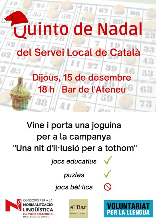 El dijous 15 de desembre, a les 18 h, alumnes dels cursos i participants dels grups de conversa en català i del programa Voluntariat per la llengua celebraran el tradicional Quinto de Nadal per acomiadar el primer trimestre del curs.