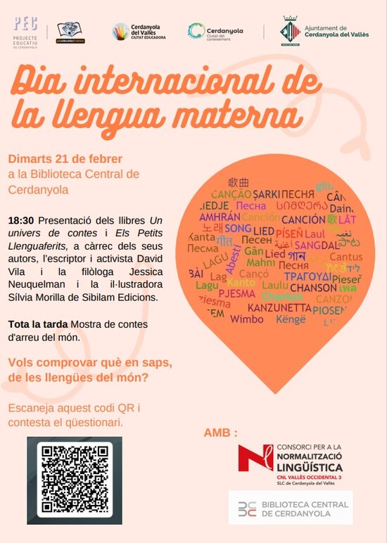 El dia 21 de febrer, a les 18.30 h, hi haurà l’acte central de la commemoració del Dia Internacional de la Llengua Materna (DILM) a la Biblioteca Central de Cerdanyola amb la presentació dels llibres Un univers de contes i Els Petits Llenguaferits, a càrrec de David Vila i Jessica Neuquelman i la il·lustradora Sílvia Morilla. Durant tota la tarda hi haurà una mostra de contes del món.