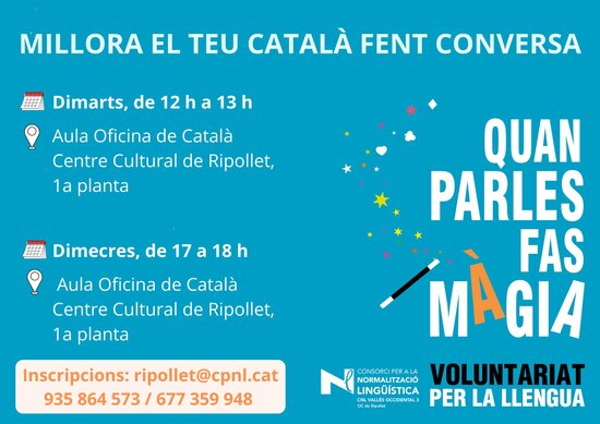El dimarts 24 d'octubre a les 12 h començarà el grup de conversa al matí, que serà conduït per una voluntària lingüística, i el dimecres 25 d'octubre a les 17 h començarà el grup de conversa de tarda, conduït per un voluntari lingüístic. Els grups es faran setmanalment els dimarts al matí i els dimecres a la tarda. Per participar-hi, es pot escriure a ripollet@cpnl.cat o trucar al 93 586 45 73 o al 677 359 948.