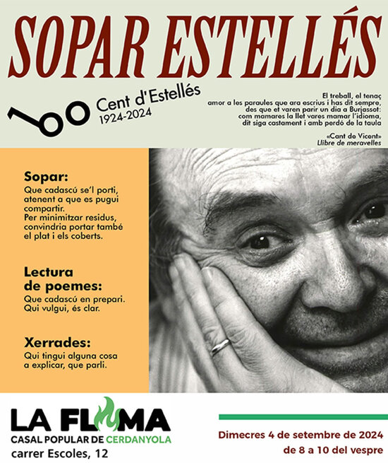 El proper 4 de setembre, Cerdanyola se suma a la proposta de la Profundació Vicent Andrés Estellés de commemorar el centenari del naixement del poeta de Burjassot amb un sopar al casal popular La Flama.