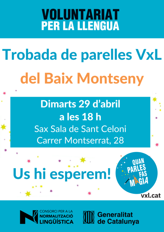 La Trobada de participants del VxL del Baix Montseny tindrà lloc el dimarts 29 d'abril, a les 6 de la tarda, a Sant Celoni (Sax Sala – c. Montserrat, 28). Hi participaran voluntaris i aprenents de les poblacions de Sant Celoni, Llinars, Sant Antoni de Vilamajor, Santa Maria i Sant Esteve de Palautordera.